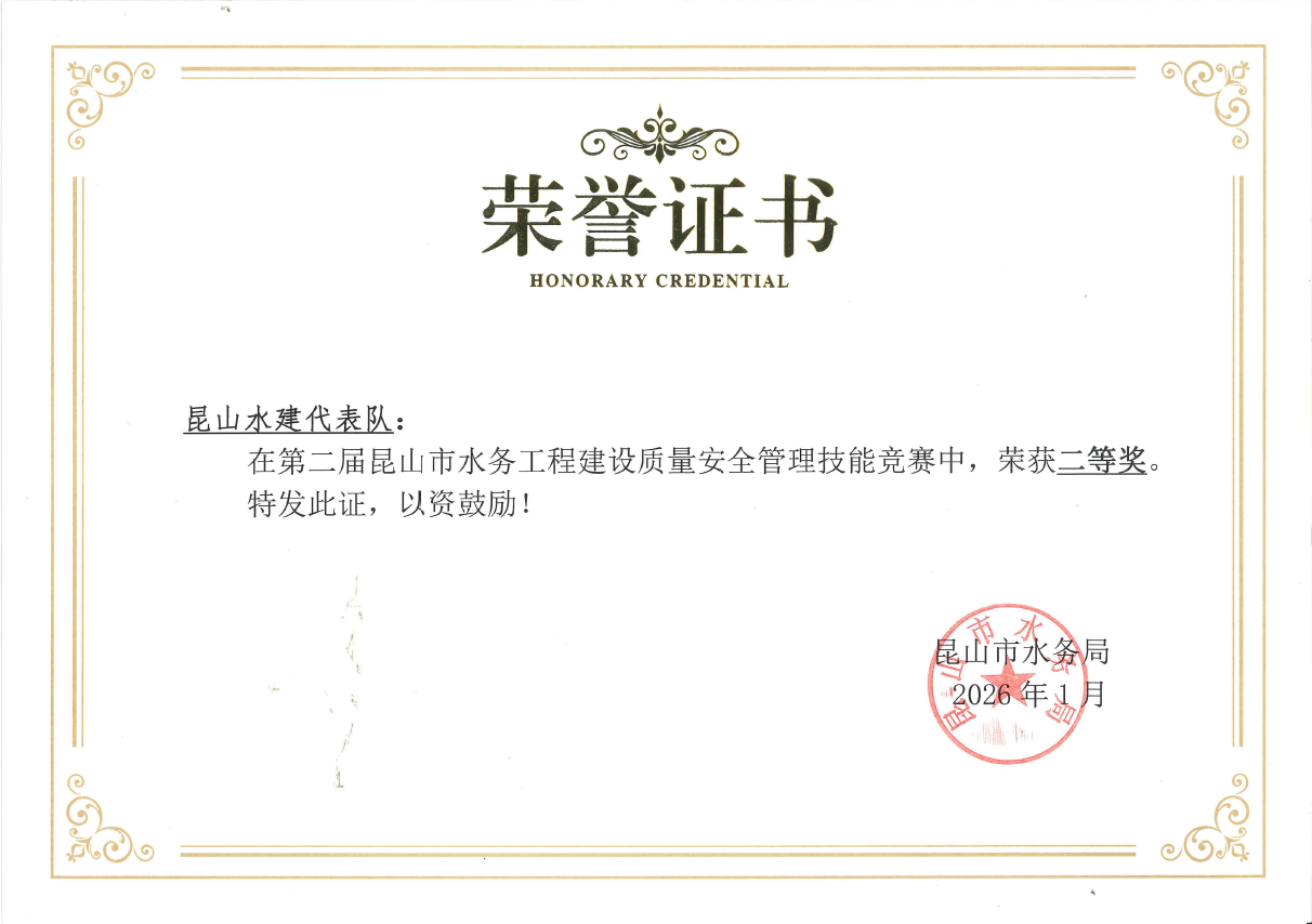 2026年1月27日我公司职工杨靖、周屹参加了市水务局主办,质安站、建设处承办的第二届全市水务工程建设质量安全管理技能竞赛,来自各区镇管理站、建设、监理、施工单位的工程建设管理人员15支队伍共计30人参赛,通过工程建设管理技能“大练兵”,锤炼水务干部队伍履职本领,营造浓厚的学习氛围。经过多轮角逐,昆山水建代表队最终荣获二等奖,市水务局副局长姚军等领导分别为获奖队伍颁发了荣誉证书,并鼓励大家珍惜荣誉,增强责任意识,坚持业务学习,抓好关键环节,用好科技手段,在今后的水务工程建设管理工作中发挥更大作用。